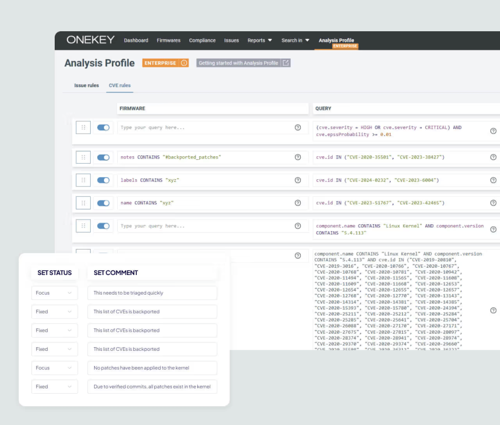 采用ONEKEY这样的统一平台可以显著优化您的安全与合规工作流程。这意味着更少的人工操作、更低的运营成本,以及清晰直观的产品安全状态总览。您将能够更快响应安全威胁,并确保产品始终符合最新的安全标准要求。