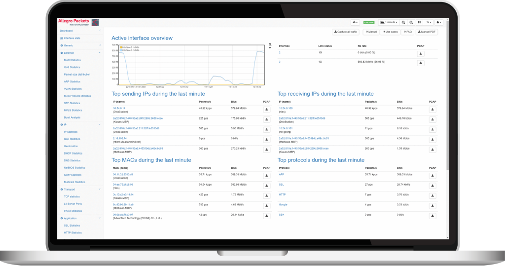 重量小于1kg的便携式Allegro 500建议用于具有约100个活动端点的千兆网线的网络。它允许您监控最近查看的20,000个IP地址和超过100万个连接,以进行追溯调试和调查。