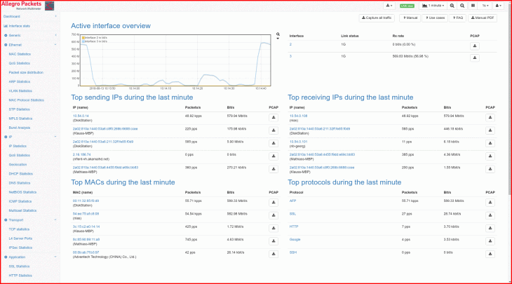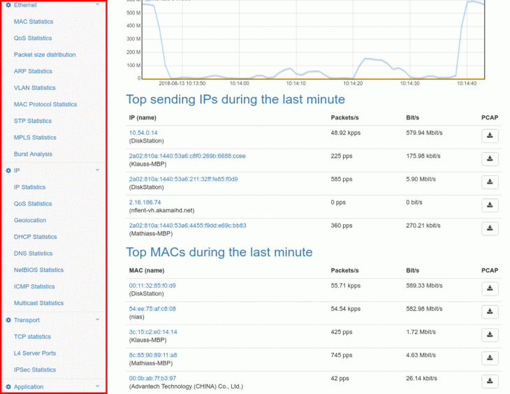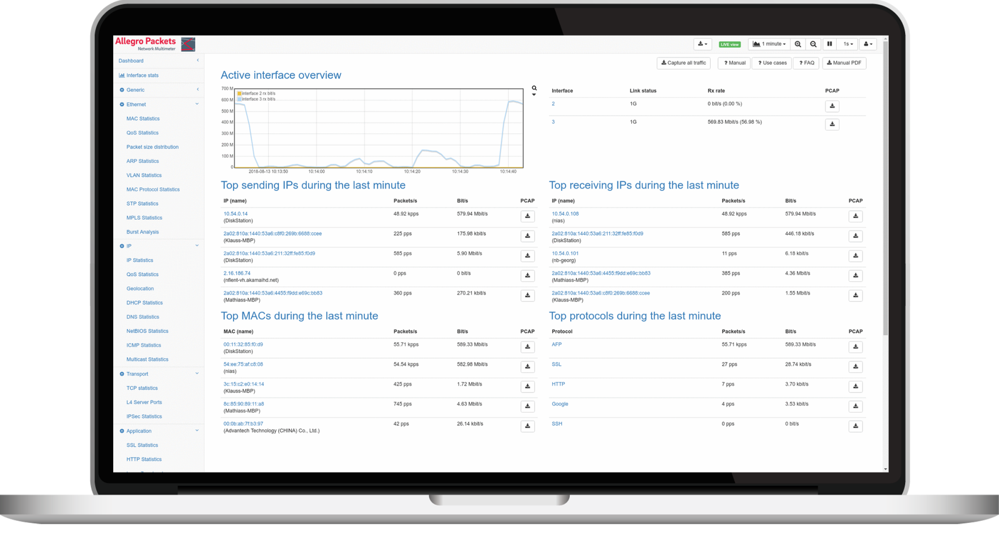 在Web界面的帮助下,可以实时和追溯地提取Pcap数据:例如,某个MAC地址的所有数据包,或某个连接的所有数据包,或某个特定时间的第7层协议的所有数据包等等。只要网页界面上出现Pcap捕获按钮,就可以下载这些数据。如果问题的原因已经过去,还可以追溯这一功能。这个功能消除了复杂的过滤器设置的需要。如果你使用Wireshark,Allegro网络万用表是一个完美的扩展。它促进了Wireshark的分析,因为只需要检查总流量的一小部分。