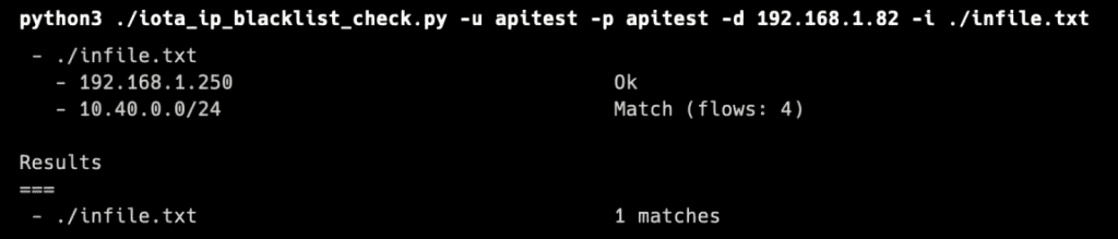 IOTA 设备提供 RESTful API,允许直接访问存储在设备上的数据。这对于集成到各种场景中非常有用。在本例中,可以过滤当前捕获内容中的黑名单 IP。用例可能是分析某些内部 IP 是否未传播到特定访问级别之外,或者某些设备是否从不应访问的区域进行访问。