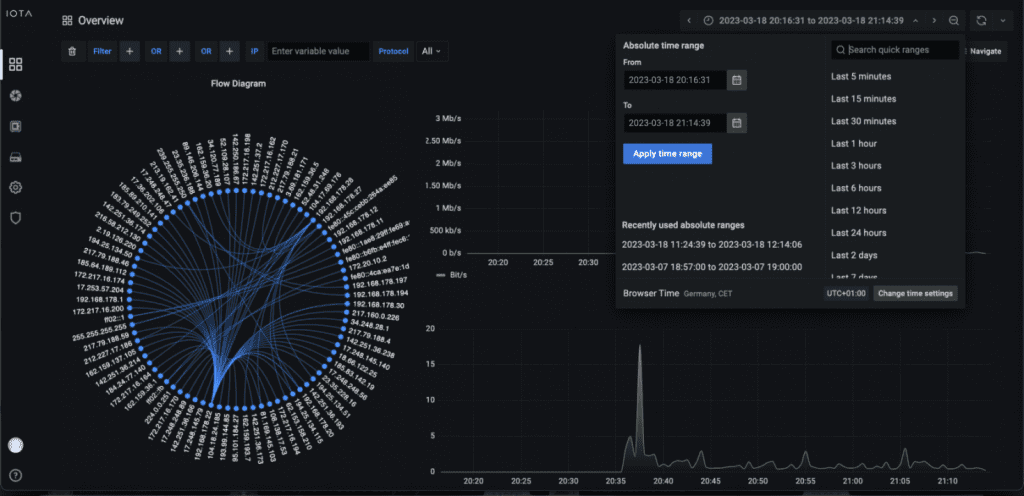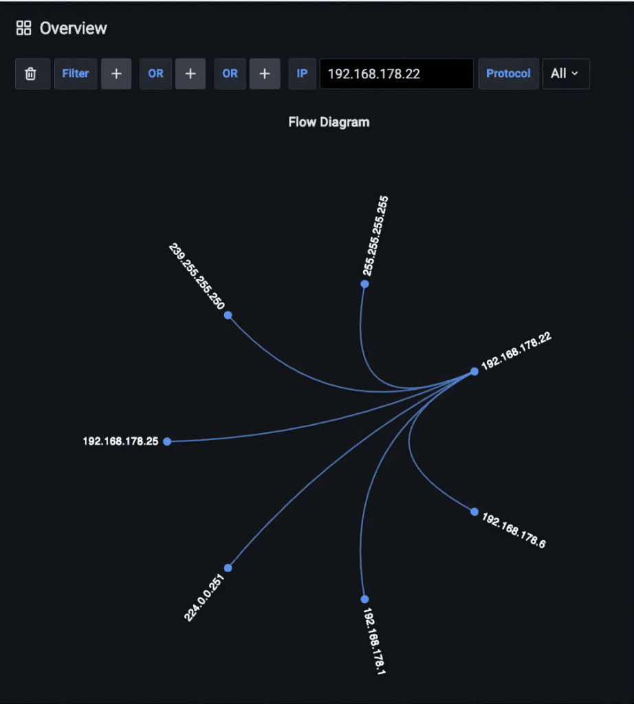 要首先识别该主机与哪些远程站进行过通信,我们可以进入 “概览 ”仪表板,然后单击流程图中的 IP 地址。然后,IOTA 会对点击的 IP 地址应用带有源地址和目标地址的 IP 过滤器。