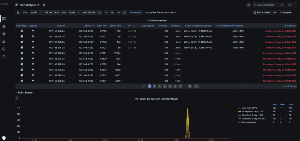 流量可以简单地导出为 PCAPNG,然后在需要时导入进行分析。IOTA 使我们能够使用提供的仪表板快速有效地分析恶意通信模式。灵活的过滤器组合和深入分析选项可加快根本原因分析。