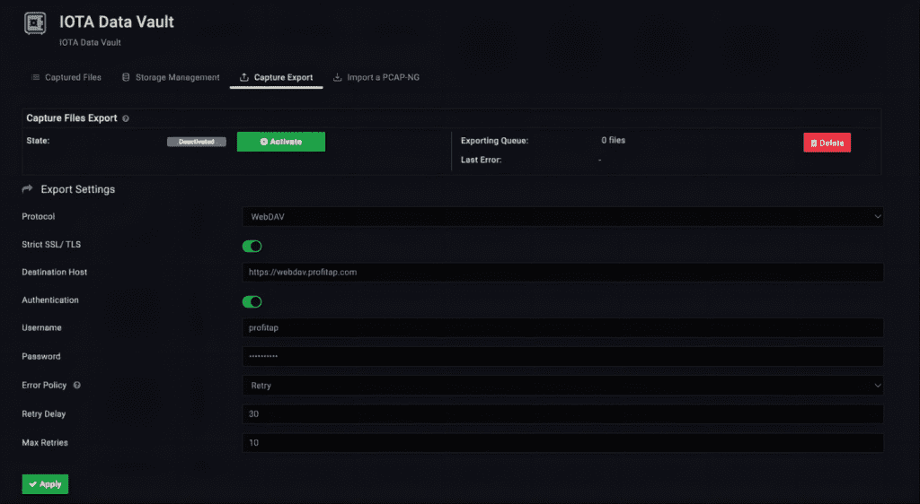 我们可以导航到左侧菜单中的 “IOTA 数据库 ”选项,以方便进行此操作。随后,我们可以进入 “捕获导出”,选择首选协议,即 WebDAV 或 FTP。单击 “应用 ”启动导出流程,即可配置凭证和错误处理。按照该协议,捕获的数据将以 PCAP 文件的形式上传到指定的服务器,每隔三十秒上传一次。