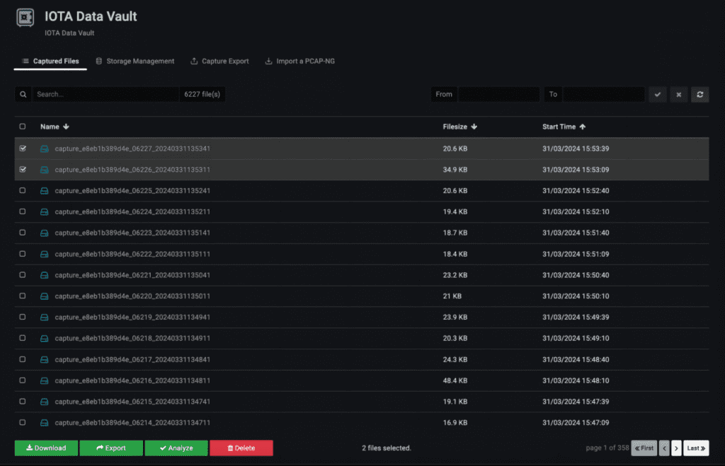 IOTA 固态硬盘上的所有捕获数据都可以作为 PCAPNG 文件在 IOTA 数据保险库的 “捕获文件 ”部分进行访问。IOTA 每三十秒生成一次新的 PCAPNG 文件。我们可以按开始时间选择所需的数据,然后点击下载。下载捕获文件后,我们可以根据需要在 Wireshark 中分析有效载荷。