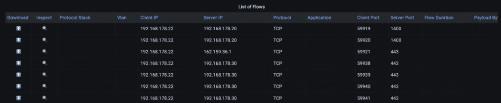 在这里,我们使用过滤器 “IP_SRC = 192.168.178.22 ”来检查客户端 192.168.178.22 不久前建立了哪些通信关系,并明确是命令和控制流量还是下载流量。