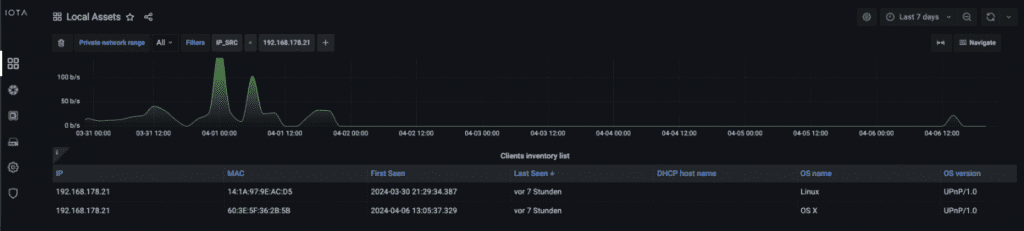 客户数据中心 IP 网络是静态寻址的,因此我们只能看到 IP 和 MAC 地址之间一对一的映射。我们进入本地资产仪表板,使用 IOTA 调查此 IDS 警报。