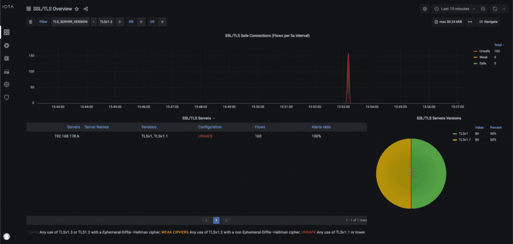 如下图所示,我们可以通过 “TLS_SERVER_VERSION < TLSv1.2 ”进行过滤,只获取不安全连接。在这里,我们有一台 IP 地址为 192.168.178.6 的服务器,它的 TLSv1 和 TLSv1.1 已激活,我们有 160 个流量受到不安全传输加密方法的影响。我们现在知道,只有这台服务器会受到这种攻击的影响。