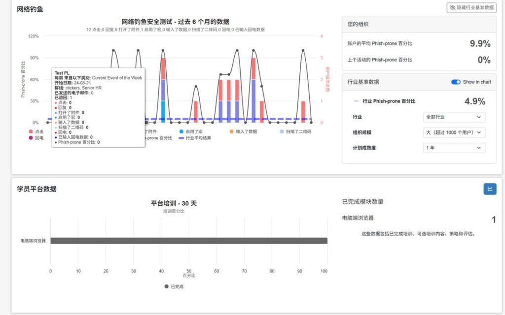 KnowBe4 提供全球最大的钓鱼邮件模拟平台,通过定期向员工发送“仿真攻击邮件”,让员工在低风险环境中学会识别威胁。点击率(钓鱼易感率)被量化评估,用于持续优化培训策略。