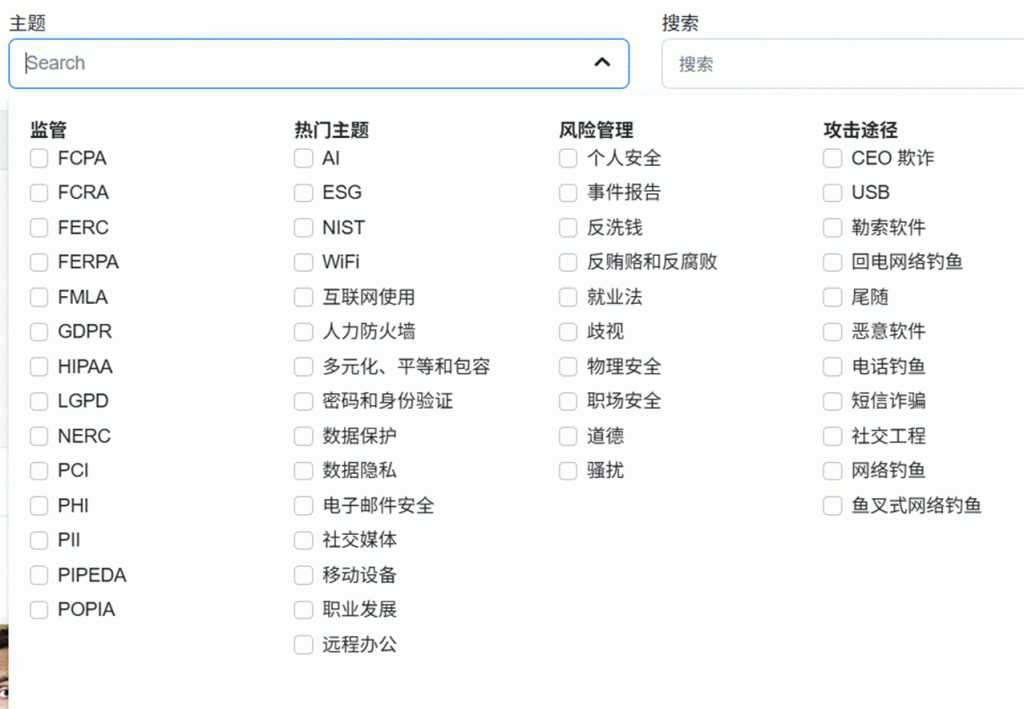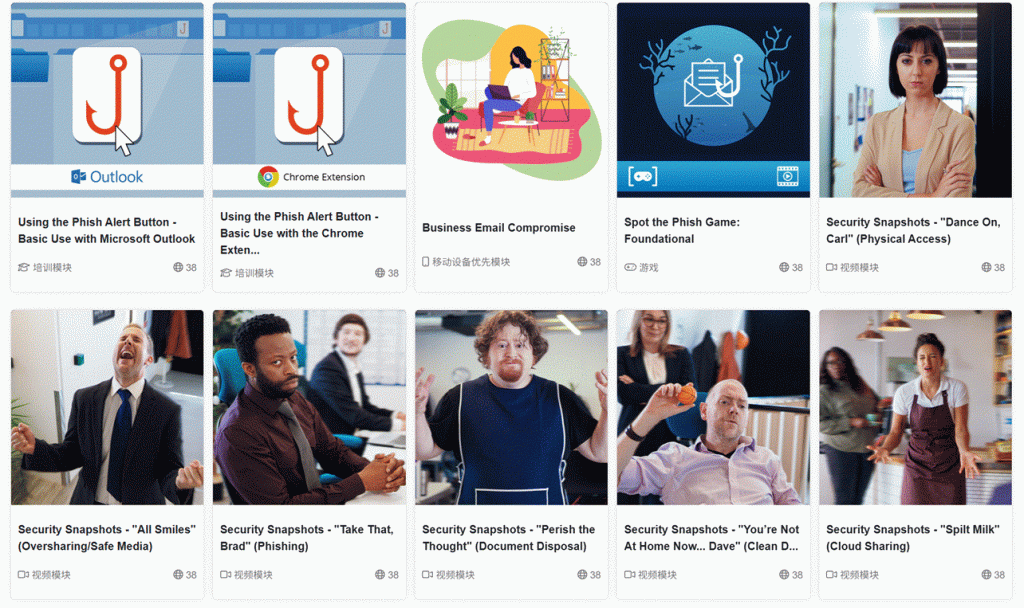 KnowBe4提供全球最大的安全意识资源库,包含1300+种培训材料,涵盖互动课件、短视频、游戏、海报等类型,主题从基础钓鱼识别到高级社会工程攻击应对。例如:
