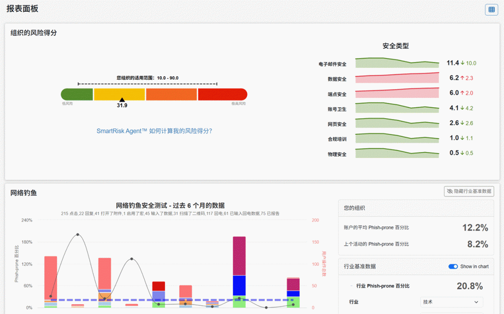 - 实时风险分析:结合用户点击率、报告习惯等数据,生成组织级风险报告,指导培训优化。