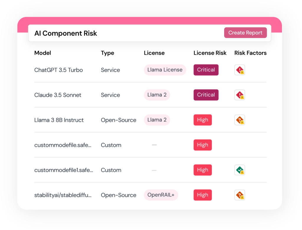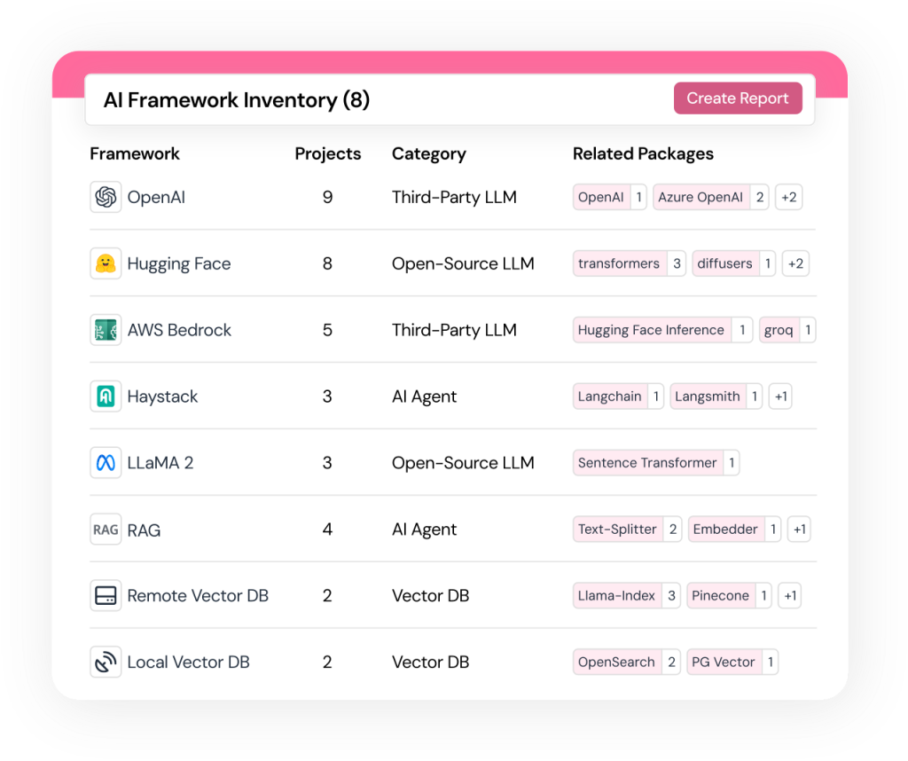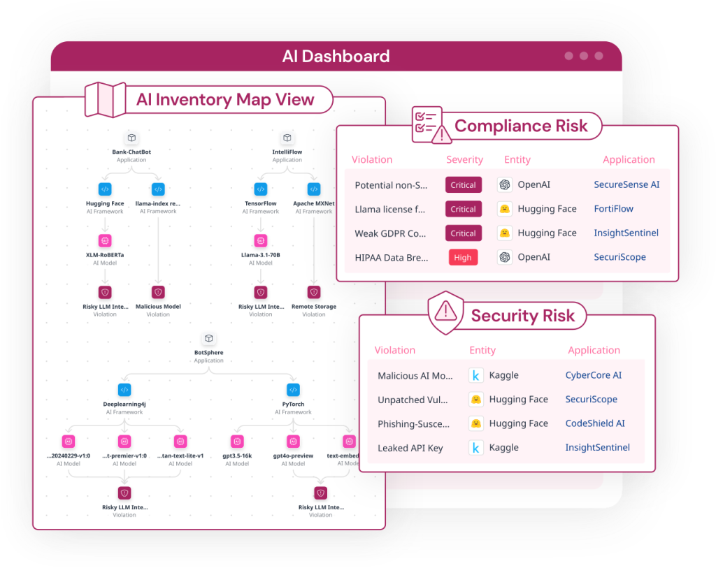 自动发现代码与依赖中使用的 AI 模型、框架及代理组件,覆盖超 50 万个来自 Hugging Face 和 Kaggle 的模型,实时生成 AI-BOM,有效管控“影子 AI”(Shadow AI),消除未授权组件带来的不确定性风险。
