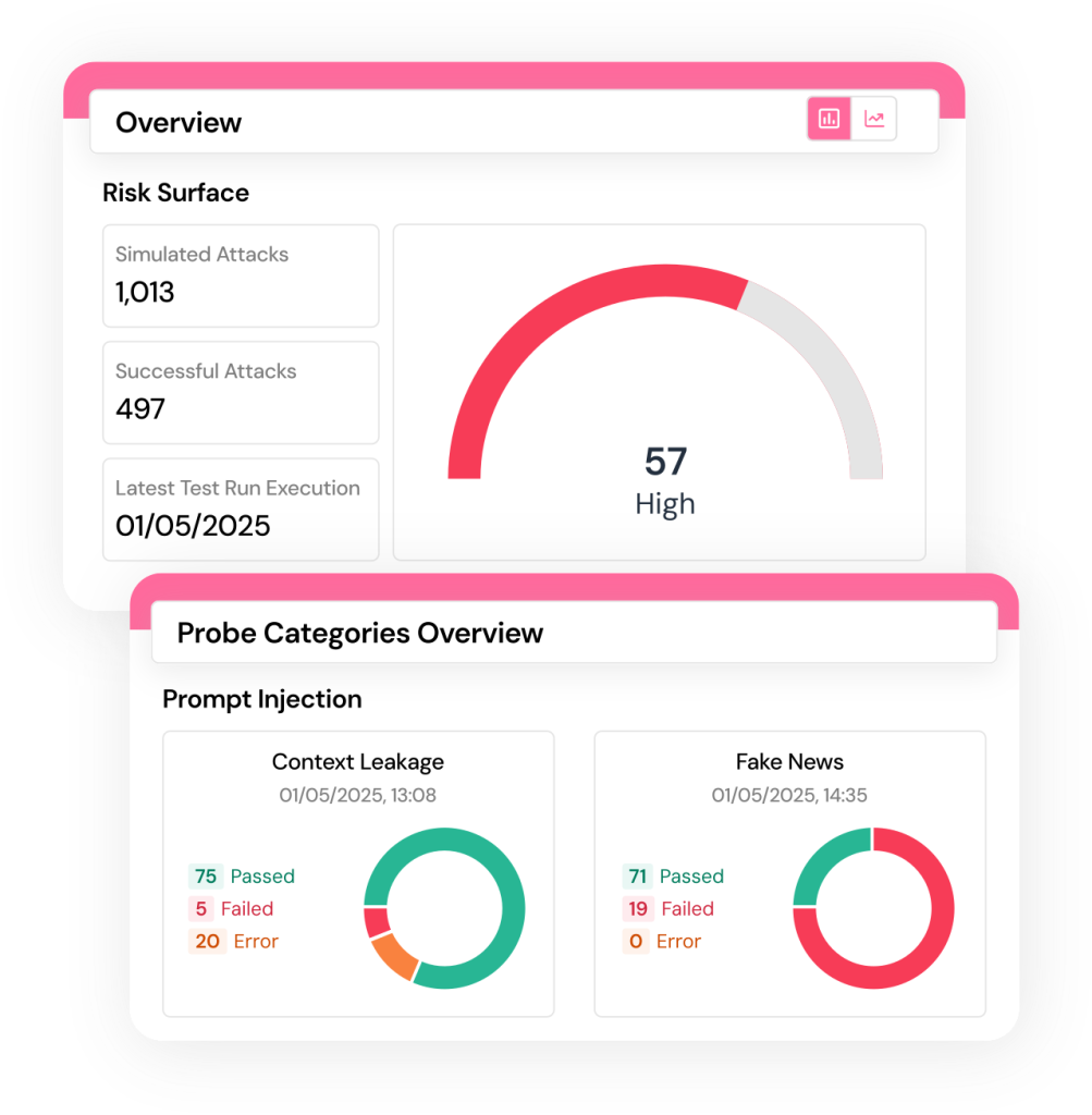 通过预置或自定义测试用例,自动化模拟提示注入、上下文泄露、数据外泄、偏见与幻觉等 AI 行为风险,全面验证 conversational AI 类应用的安全性,防范意外行为后果。