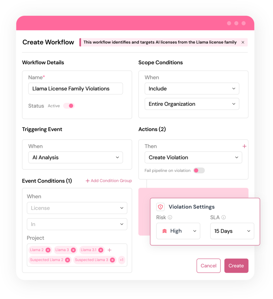 借助 Mend 强大的策略引擎与自动化工作流,在软件开发生命周期中持续确保 AI 应用符合治理策略。支持对模型使用、许可证合规和提示安全设置统一规则,并通过审批流程实现在大规模应用中的强制合规执行。