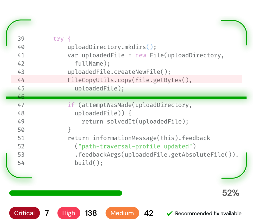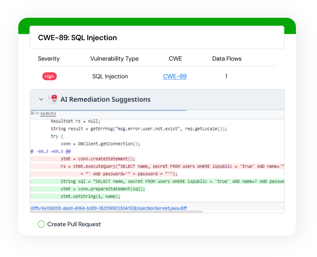 在提交阶段即提供 AI 优化的修复方案,修复准确率较传统工具提升46%,有效降低开发者负担。无需切换上下文,开发人员可在原有工作流中快速解决安全风险,避免人工修复导致的延迟与错误。