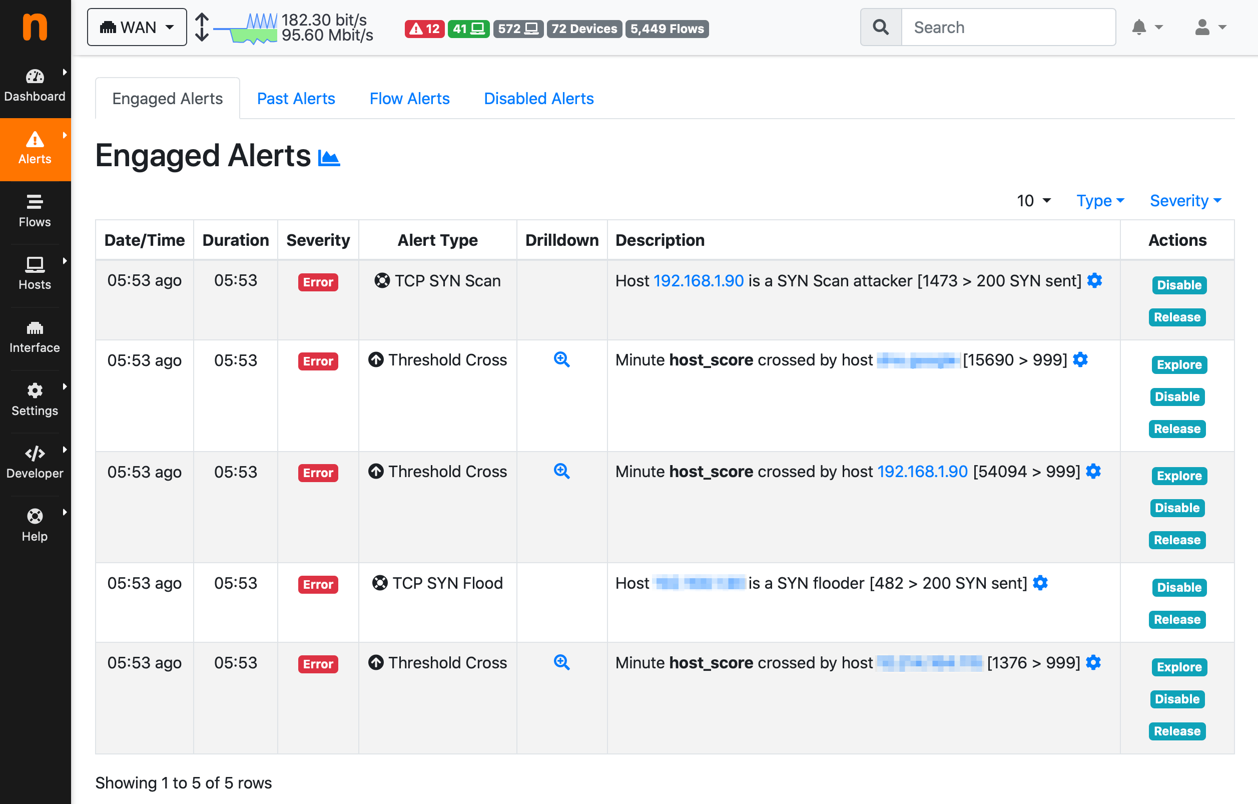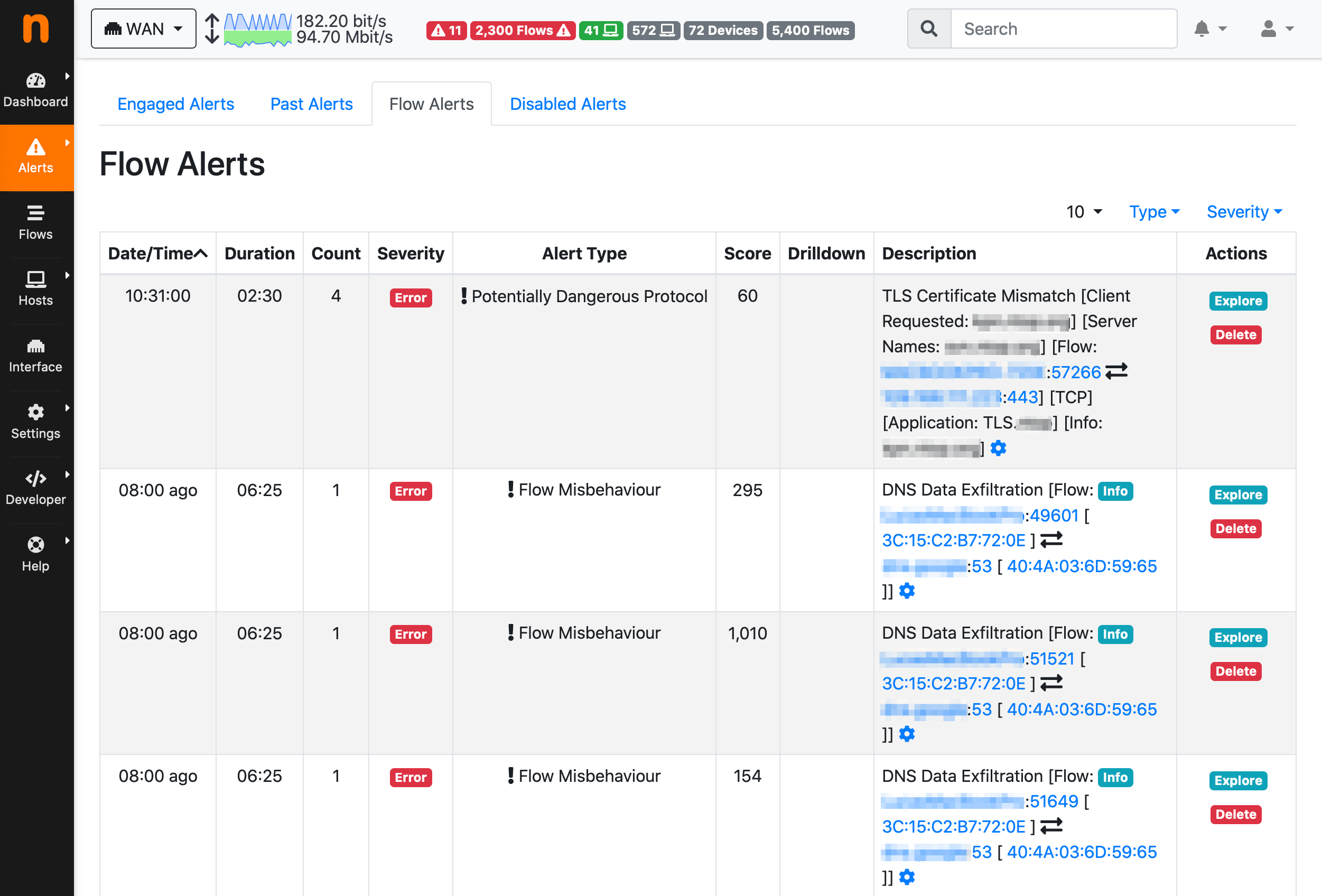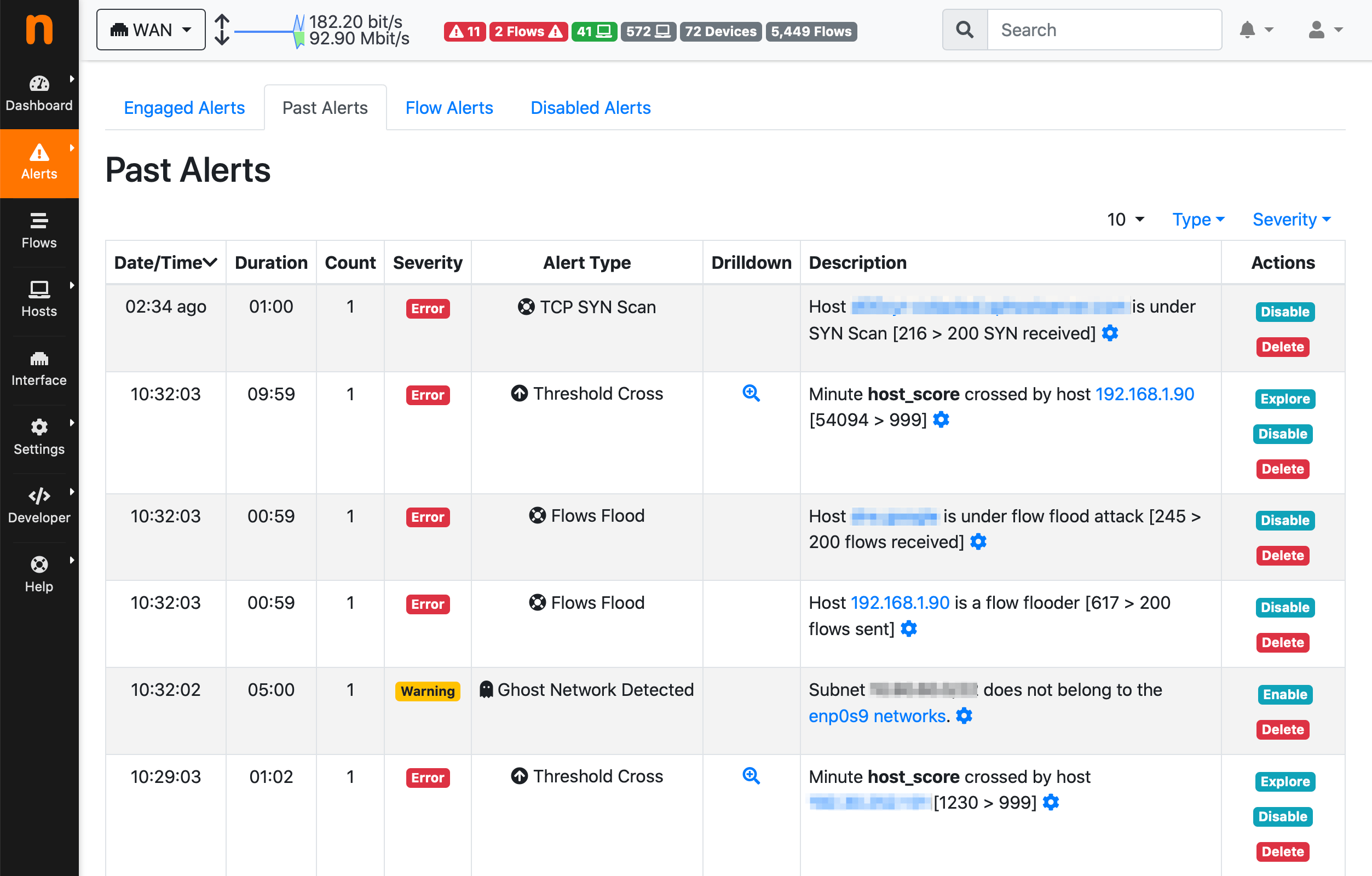 在检测到某些条件(超过阈值、可疑行为等)时生成警报(针对流、主机、接口等)