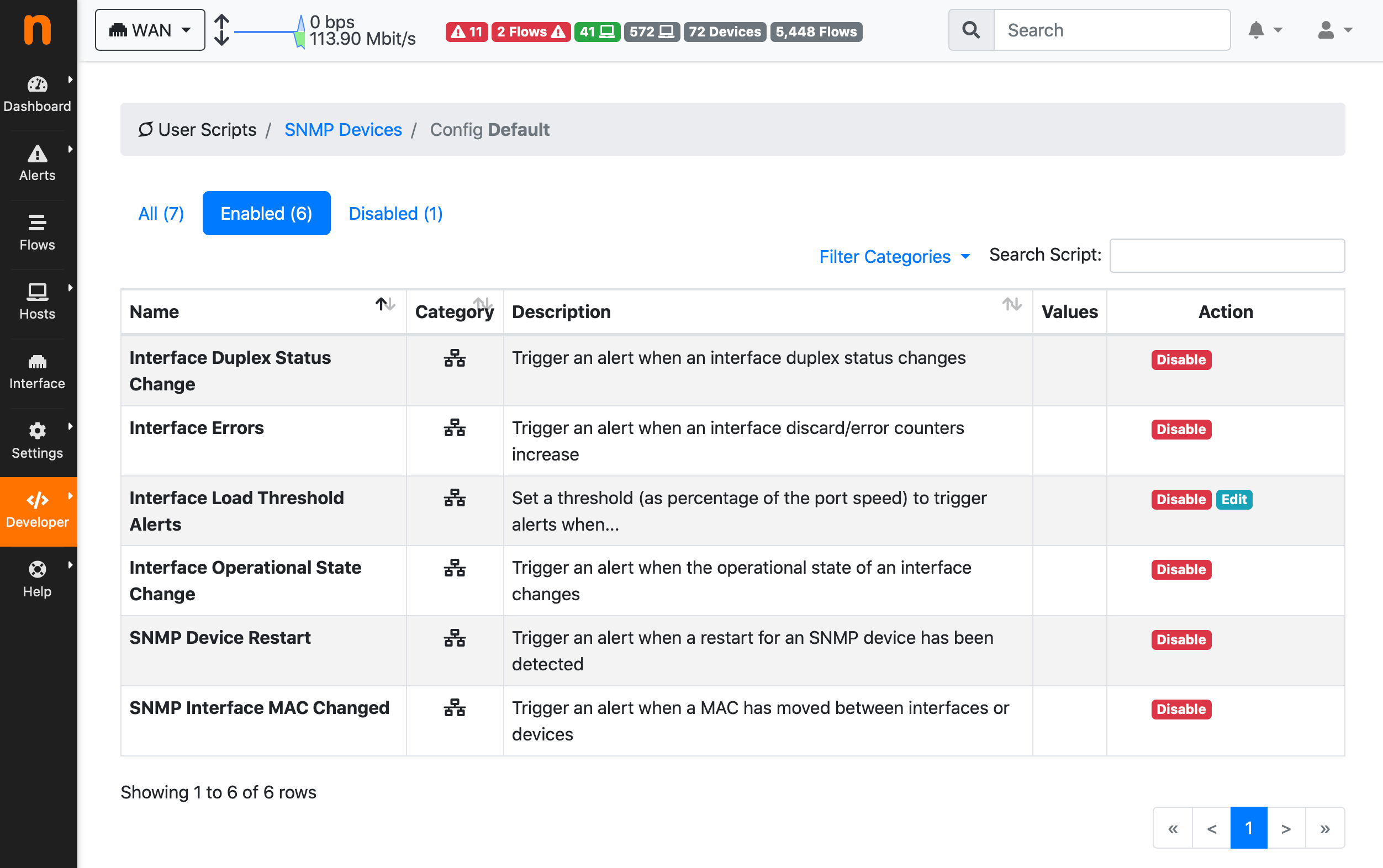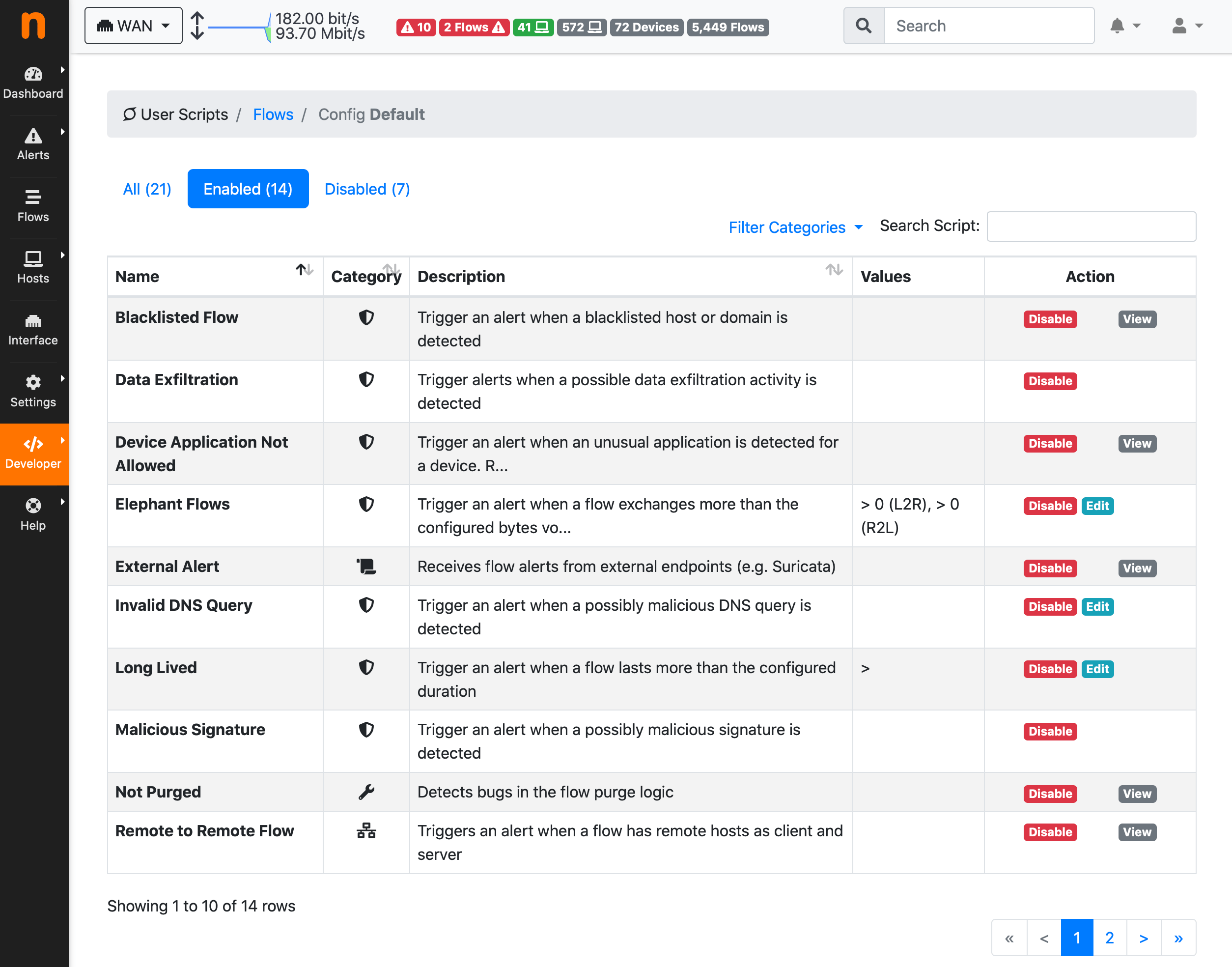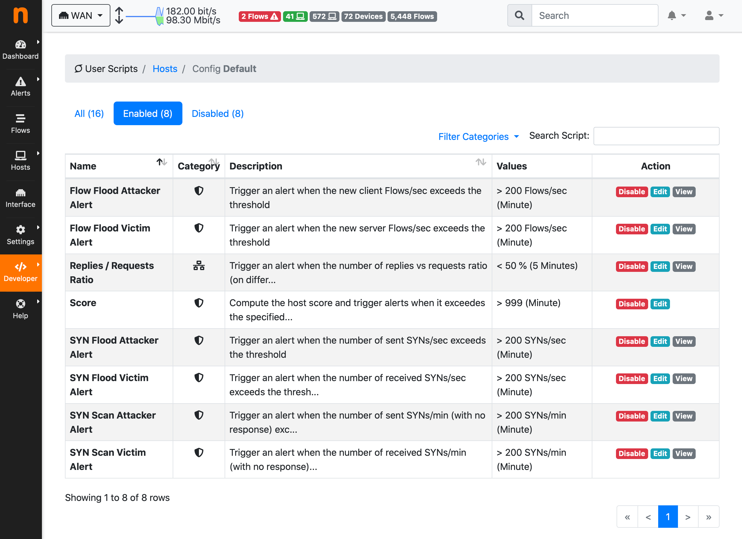 在检测到某些条件(超过阈值、可疑行为等)时生成警报(针对流、主机、接口等)