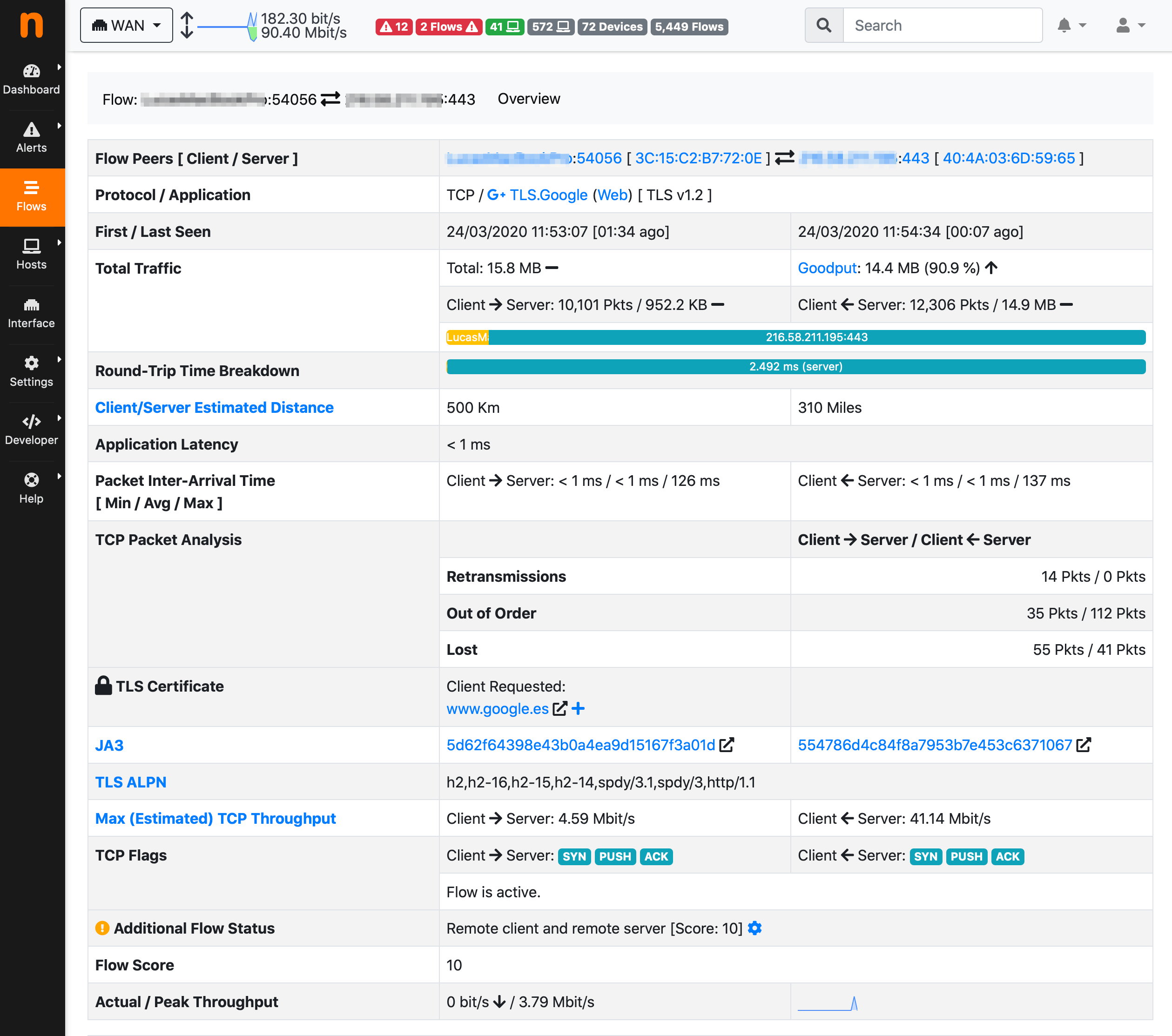 • 监控和报告实时吞吐量,网络和应用程序延迟,往返时间(RTT),TCP统计信息(重传,乱序数据包,丢失的数据包)以及已传输的字节和数据包