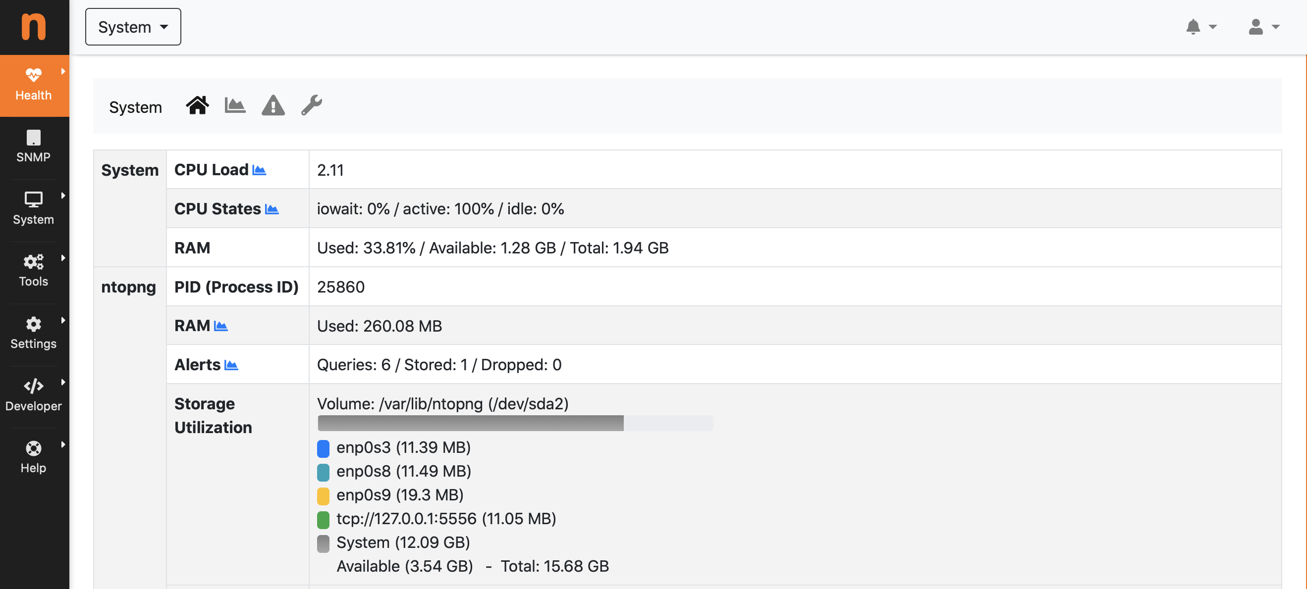 监控系统、运行 ntopng 的计算机、运行状况(CPU 使用率、RAM 使用率、使用的磁盘空间等)