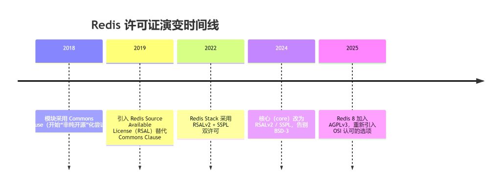 • 到 2025 年 5 月 1 日,Redis 再次调整:加入 AGPLv3 作为可选许可之一。