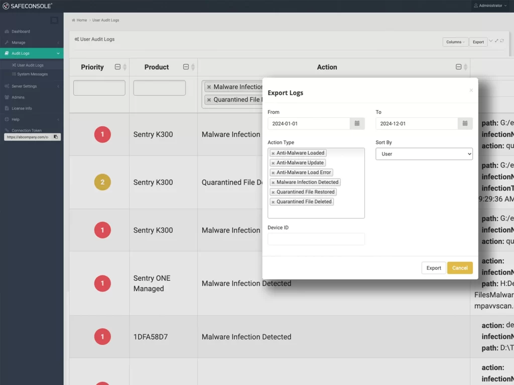 当检测到威胁时,它会被记录下来并实时或下次设备连接到服务器时报告给SafeConsole管理门户。管理员可以查看详细的审计日志,包括威胁类型、用户和检测时间。