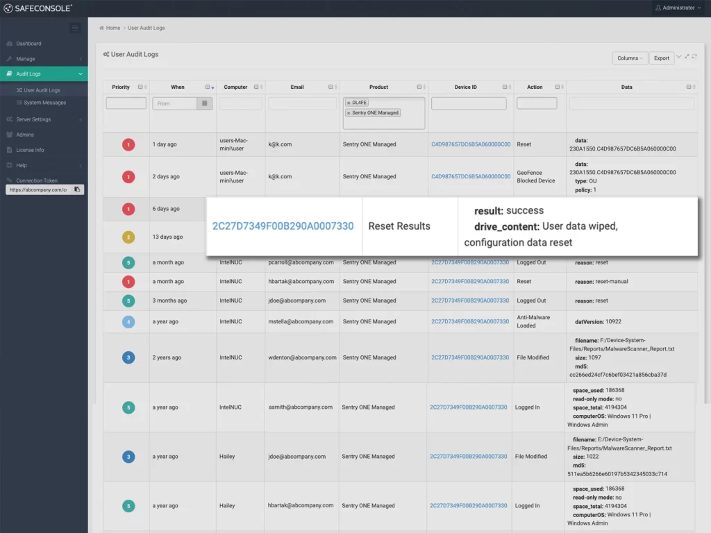SafeConsole允许管理员远程重置加密USB驱动器上的密码,这一操作不会丢失任何数据,帮助用户安全、快速地重新获得对其驱动器的访问权限。
