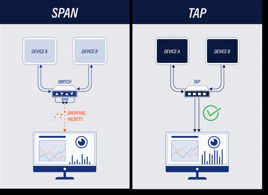 TAP 可查看穿过网段的每个数据包,包括畸形数据包、VLAN 标记以及交换机可能会丢弃或不会映射到 SPAN 端口的第 1 层错误。